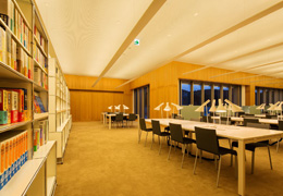 本や雑誌、新聞などの他、DVDなどを鑑賞するコーナーや学習スペースが設けられています。照明は、天井を照らす間接照明が用いられ、目に優しくやわらかな光で部屋全体を明るくしています。また、学習机には、個別に卓上照明が取り付けられています。