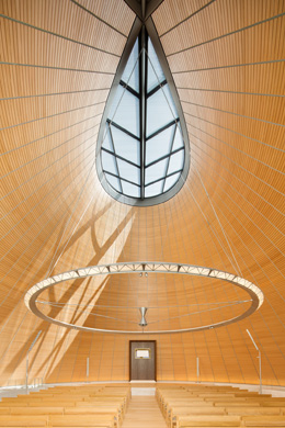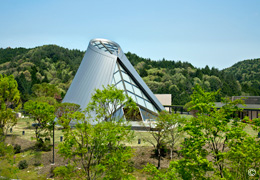 MIHOチャペルは、正面上部の1点のみでつながる、とても特殊な構造をしているため、施工するにあたって、多くの困難がともないました。また、外壁に使われているステンレスパネルは、ビーズ・ブラスト仕上げと呼ばれる特殊加工を施しています。およそ18メートルのパネルを特殊加工できる技術は、日本にしかなく、千葉県の工場より新幹線の車輛を運ぶトラックにのせ、真夜中に少しずつ運ばれて来ました。正面と上部にはめ込まれているガラスは、ドイツ製の特殊ガラスが使用されています。内部は、加工された吉野杉の板が、1列160枚で51列の合計8,160枚が並べられています。壁が3次曲面を描いているため、一つとして同じ形はなく、木材加工の優れた日本だからこそ可能になった技術と言えます。