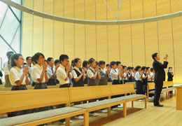 チャペルでは、朝と夕方に生徒と教職員が集まり、感謝の祈りを捧げます。壇上のお額には、岡田茂吉師の書「真善美」が掲げられています。一人ひとりの言動が真善美に近づくように祈ります。その祈りは、きっと、世界平和へとつながることでしょう。