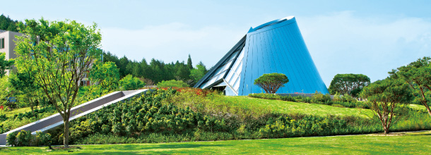チャペルは、敷地のほぼ中央に位置し、美学院のシンボルです。設計者のI.M.ペイ氏は、生前の小山美秀子師に思いをはせ、扇の形を丸めたシンプルなデザインに仕上げました。ペイ氏が初めて設計した建物もチャペルであり、集大成とも言えるこのプロジェクトで設計したのも、奇しくもチャペルでした。