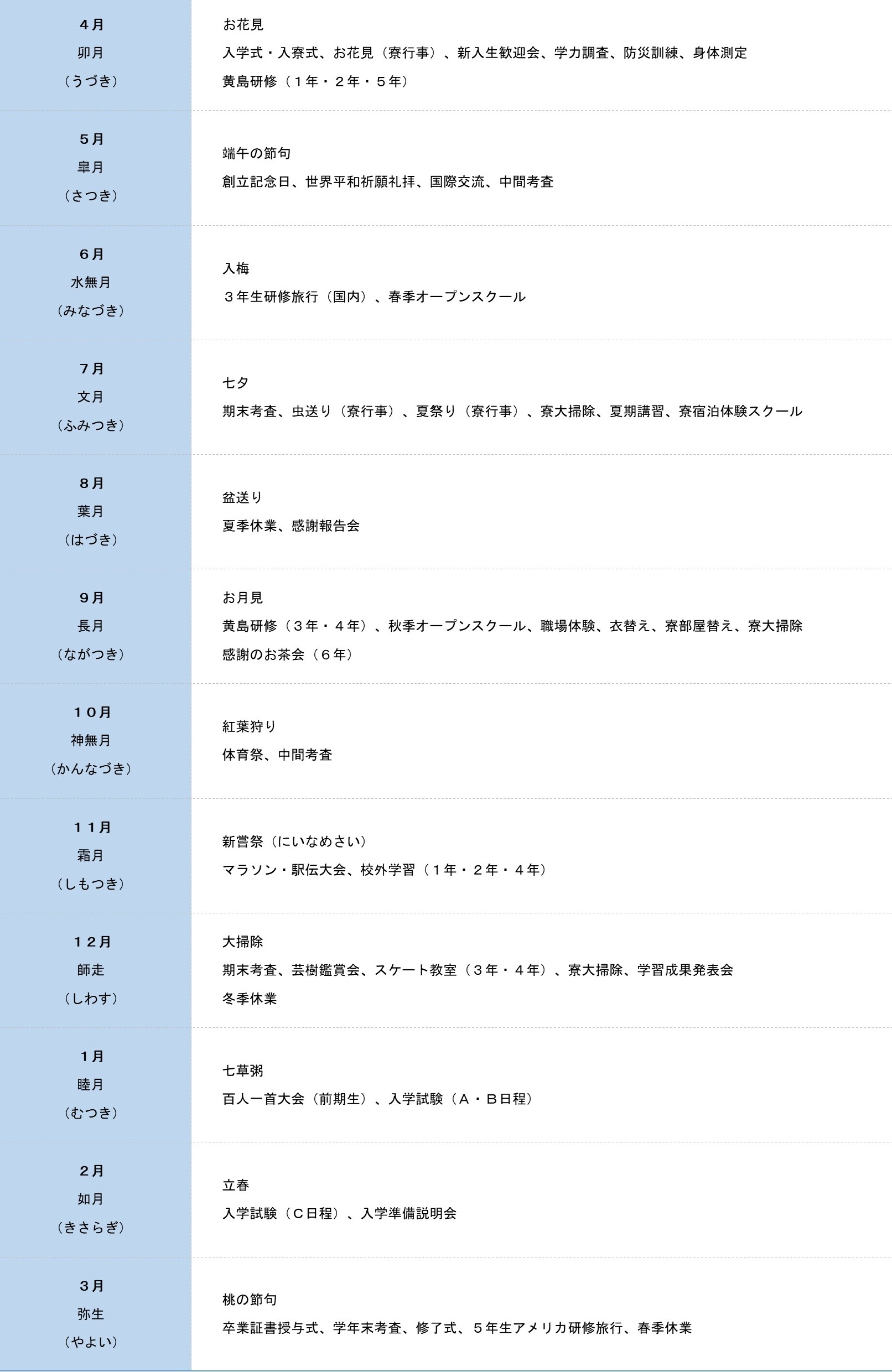 年間行事は、地域と連携し多くの方に来ていただける楽しい催し(体育祭や文化祭など)があります。また、旧暦にしたがった「和」の伝統行事は、私たちに新しいリズムをあたえてくれることでしょう。このような行事は、季節の変化を感じ取りながら、自分たちの成長過程を見つめていく大切な機会です。生徒自らのさまざまな発想によって多彩な行事が生まれてくるのがたのしみです。