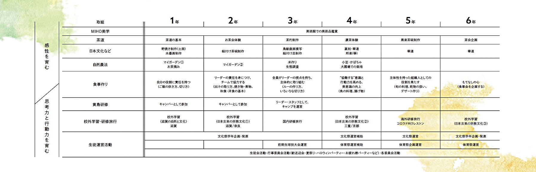 本校は全寮制で、中学生の段階から親元を離れ、朝の目覚めから就寝まで、点呼・清掃・洗濯、食事作りから片付けまで、自分たちのことは自分たちでする生活を皆で協力して行いながら、日々の学習をします。そして、本校の生徒は北海道から沖縄まで日本全国にわたり、海外からの入学生もいます。学校という小さな社会の中で、子ども達はさまざまな壁にぶつかります。習慣や文化の違いを乗り越え、ともに切磋琢磨しながら過ごすことにより、自分自身を見つめ直し、主観的に考えるのではなく、客観的に物事を考え自分達で解決していく。また学習時間の確保など時間の使い方も洗練されていくと、豊かな学校生活ひいては豊かな人生につながっていきます。自然に恵まれた環境の中で、6年間規則正しい生活を過ごすことで、感謝の心、思いやりの心、協調性、自主自立、自労自治、主体性が育まれていきます。