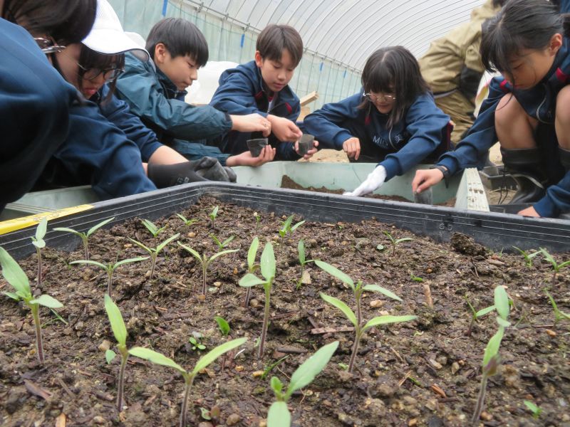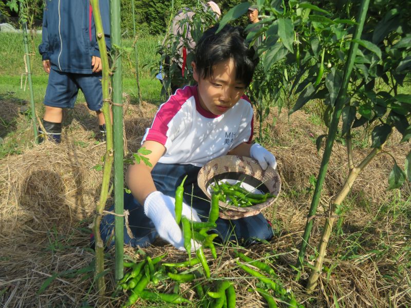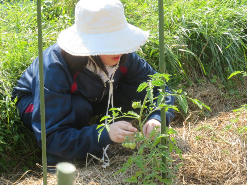 たたみ2畳分、1人1坪割り当てられた「マイガーデン」で、生徒たちは無肥料・無農薬の自然農法により、さまざまな作物を育てます。土と水と太陽の力だけを信じて無心に世話をし、やがて収穫した作物を口にするとき、子どもたちは畑と一つになり、生命の調和を肌で感じているように思います。小さな畑は、“目に見えない力”への感動と、感謝を教えてくれる自然の教科書です。