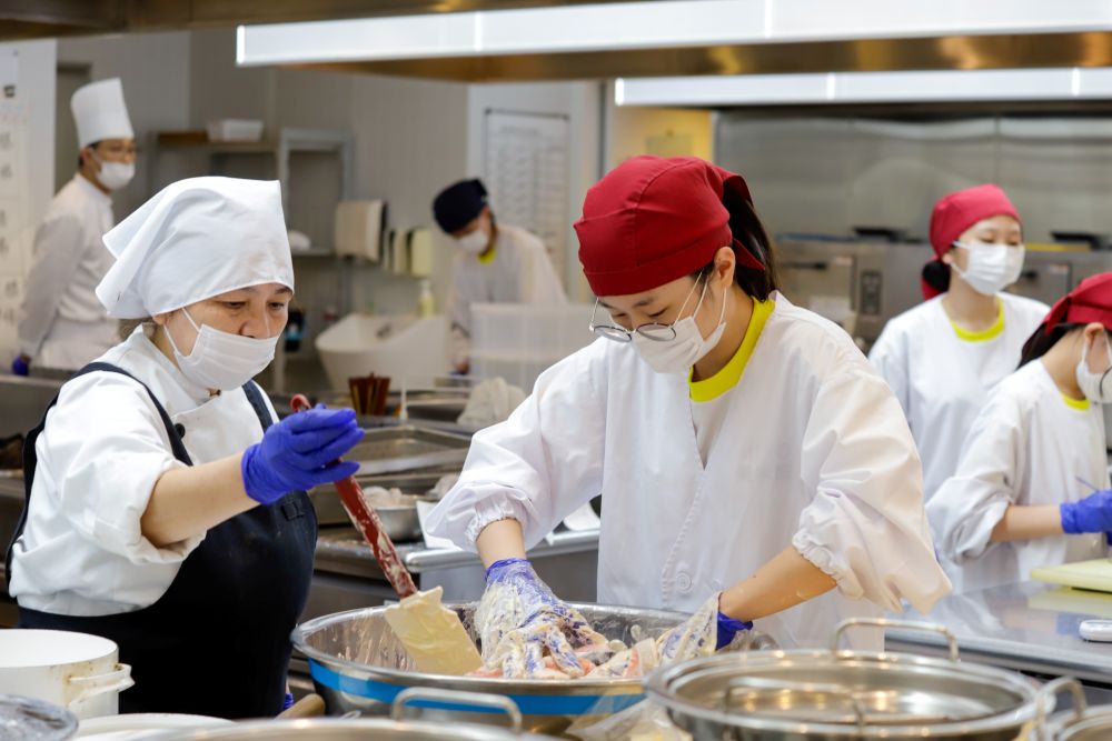 日々のメニューは、四季折々の旬の食材に合わせて献立が組まれていきます。時期によっては、同じ野菜がたくさん入ってくることもありますので、煮物、焼き物、揚げ物など、飽きが来ないように工夫しながら、美味しく頂きます。調理方法を変えることで、味覚や食感が変化することを学び、同じ食材、同じ調理方法で料理したにも関わらず、作る人によって、味が変わることに気付くことで、まごころを込めることの大切さを学んでいきます。