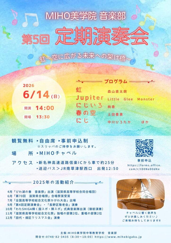 本校音楽部による「第5回 定期演奏会」をMIHOチャペル内で開催いたします。