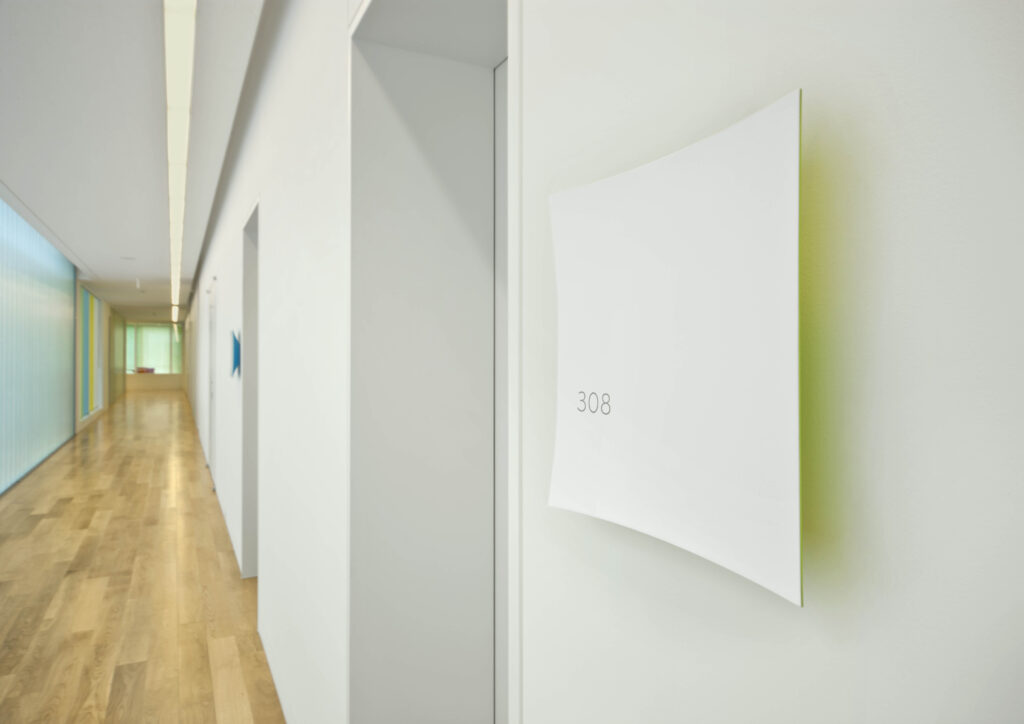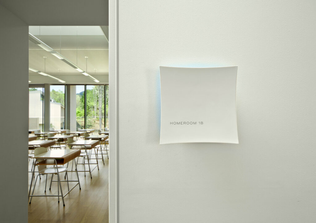 MIHO美学院のロゴをはじめ、キャンパス内の表示板等を含めたサイン(表示)計画は特有のデザインで、ペンタグラム社のアボット・ミラー氏が担当しました。ペンタグラム社は米国ニューヨークを拠点とした、ティファニーのブランディング・デザインやシカゴ美術館新館のサイン計画等、数多くの著名なグラフィックデザインを手掛けた実績のある、世界で最も評価の高いデザイン会社の一つです。ミラー氏がデザインしたMIHO美学院のロゴは、ミラー氏がMIHO MUSEUMを訪れた際に見た、日本の美術品の一つからインスピレーションを得て、デザインされました。 グラフィックデザインに使用される書体は、日本語と英語ではそれぞれ別々の書体を使用しながら、並記しても絶妙なバランスを保持し、両方とも繊細な線の太さと丸みを帯びた柔らかい表情を持つ独特なものを採用しています。各教室などの部屋名表示板は、壁から少しだけ浮いているように見える形状と微妙な曲面を用いた特徴的なデザインで、表示板の裏面にだけ彩色が施され、白い壁に色が映り、発光しているかのように見せる独創的なデザインとなっています。
