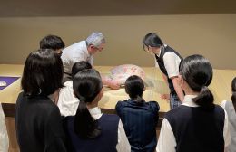 檜の薄板27枚をつなぎ合わせて作られた室町時代の檜扇を間近で見せて頂きました。また、現代に作られた檜扇を持たせてもらい、実際の使い方などを学びました。