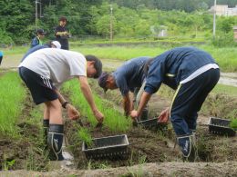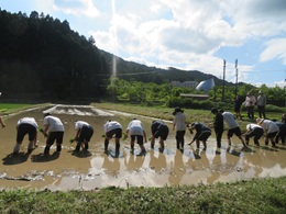 6月15日に乾田苗代で育ててきて1本1本取り分けていた苗を3年生が田んぼに横一列にならんで田植えを行いました。
