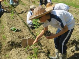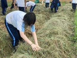 4年生の自然農法の授業で、ある程度育った野菜の苗の上に、土の乾燥を防ぐために敷き草を敷き詰めました。