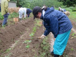 あいにくの雨の中、マイガーデンに生えてきている野菜以外の草を取り除く作業を1年生が行いました。