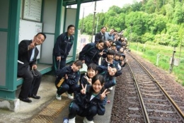 復興が待たれる信楽高原鉄道の無人駅で記念撮影