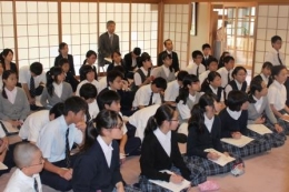 岡田茂吉師ゆかりの建物でお話を聞く生徒