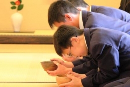 薄茶を頂いた後、お茶碗を拝見する男子生徒