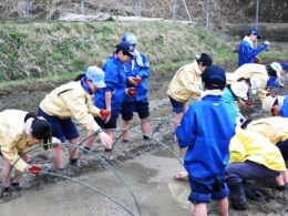 まだ慣れない手つきで種もみを撒く生徒