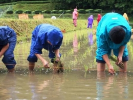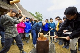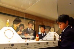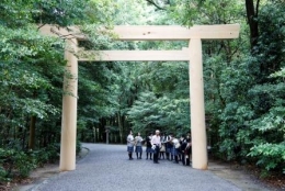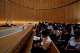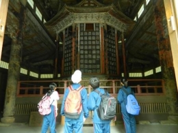 三井寺の一切経を収める八角輪蔵を眺める生徒