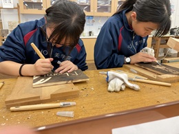 下書きをしたところを彫刻刀で彫る生徒