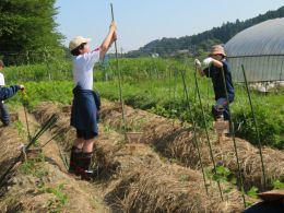 1年生の自然農法の授業で育てているトマトなどの夏野菜が成長してきたので、脇芽を摘む芽かき作業を行い、支柱を立てて誘引作業を行いました。これからの成長が楽しみです。