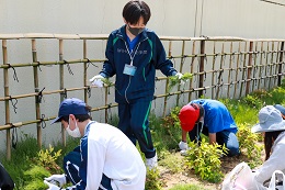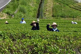 学校の隣接地で自然農法でお茶を栽培されている山本農園へ出向き、茶摘みを体験させて頂きました。その後、調理実習室でフライパンでお茶を炒り、お湯を入れてお茶を頂きました。