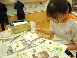 学校近辺に咲いている花をモチーフにして、水彩画で絵手紙を作りました。