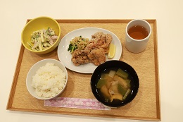 主菜「鶏のからあげ・小松菜ともやしのからし醤油」、副菜「マカロニサラダ」、汁物「チンゲン菜のみそ汁」を調理しました。