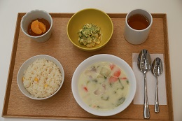 主菜「ホワイトシチュー・とうもろこしごはん」、副菜「ブロッコリーのミモザサラダ」、デザート「みかんのクラッシュゼリー」を調理しました。