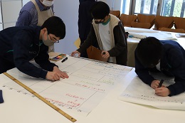 2年生男子が食事作りのために打合せを行い、献立やメニュー表を模造紙に書き込みしました。