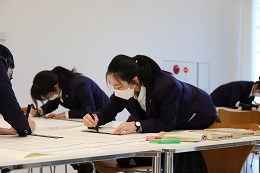 模造紙にスケジュールや献立を書き込む生徒
