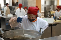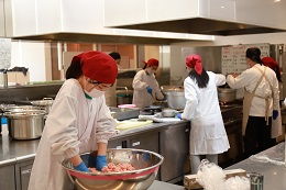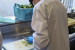 食堂棟1階の下処理室にて、仕込みをしました。