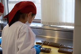 こんにゃくを包丁でカットする生徒