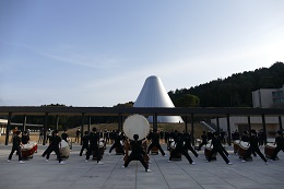 晴天の下、太鼓を叩く太鼓部メンバー