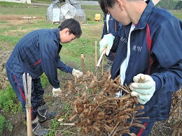 3年生が自然農法の時間で、鎌で大豆を刈り取りました。