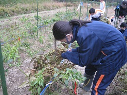 1年生が自然農法の時間で、大豆の収穫を行い、その後、ししとうの乾燥状態を観察しました。
