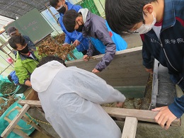 箱の壁に大豆を叩きつけて脱粒する生徒たち